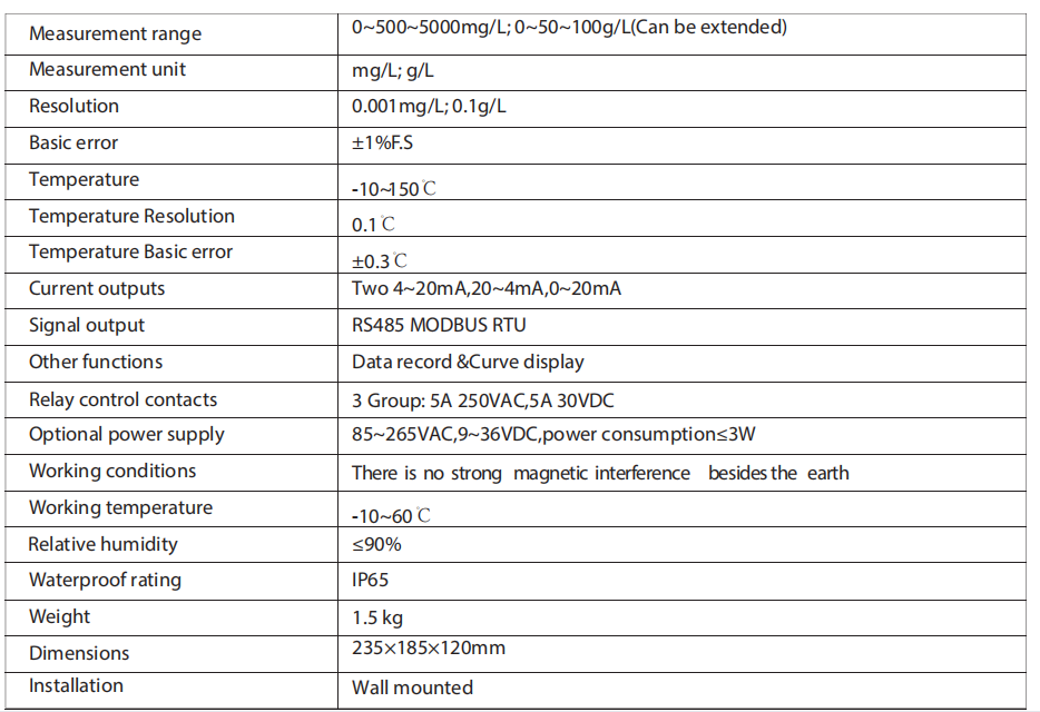 4. 0-500 мг/л, 0-5000 мг/л, 0-100 г/л, даступныя розныя дыяпазоны вымярэння, падыходзяць для розных умоў працы, дакладнасць вымярэння менш за ±5% ад вымеранага значэння.